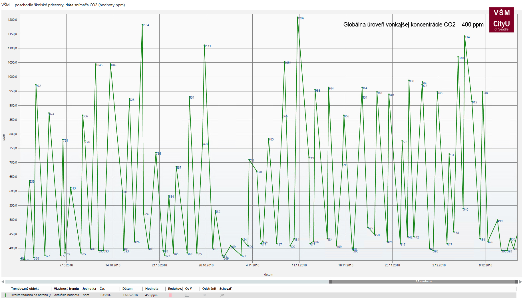 VŠM uskutočnila v jesennom trimestri porovnávací výskum hodnôt CO2 v školských priestoroch budovy v Bratislave, ktoré sa udávajú v jednotkách ppm (parts per million). Na základe získaných údajov zo snímačov vzduchotechniky sme zistili, že študenti VŠM/CityU majú v učebniach v priemere 5,9 násobne nižšiu koncentráciu CO2, ako astronauti NASA vo vesmíre! Podľa nameraných hodnôt bola najvyššia koncentrácia CO2 počas jesenného trimestra nameraná začiatkom novembra a predstavovala úroveň 1,209 ppm. Podľa výskumov NASA, každý nárast koncentrácie CO2 v priestore o 1,316 ppm dvojnásobne zvyšuje pravdepodobnosť bolestí hlavy. Zároveň výskumy Harvard University ukazujú negatívny vplyv vyšších koncentrácií CO2 na kognitívne procesy, ako schopnosť učiť sa, kriticky myslieť, či správne sa rozhodovať.